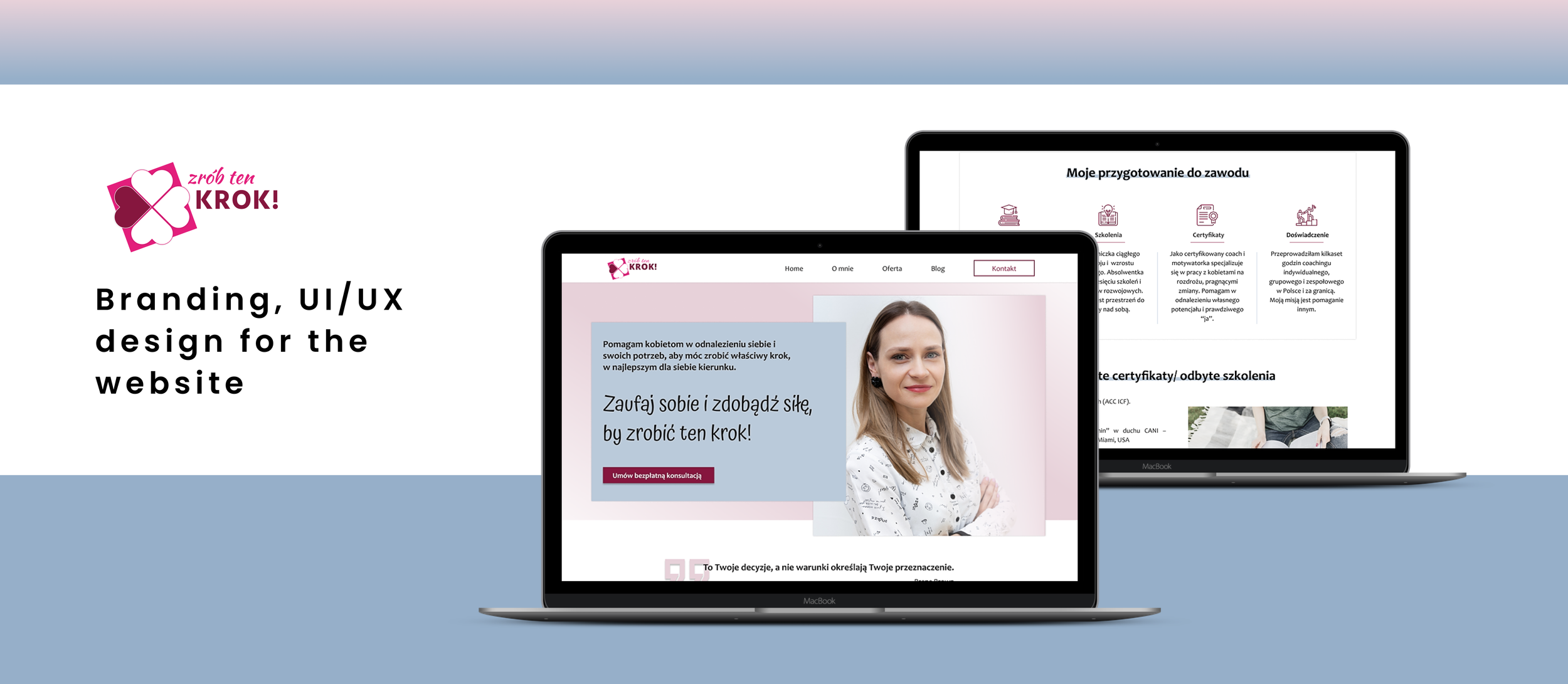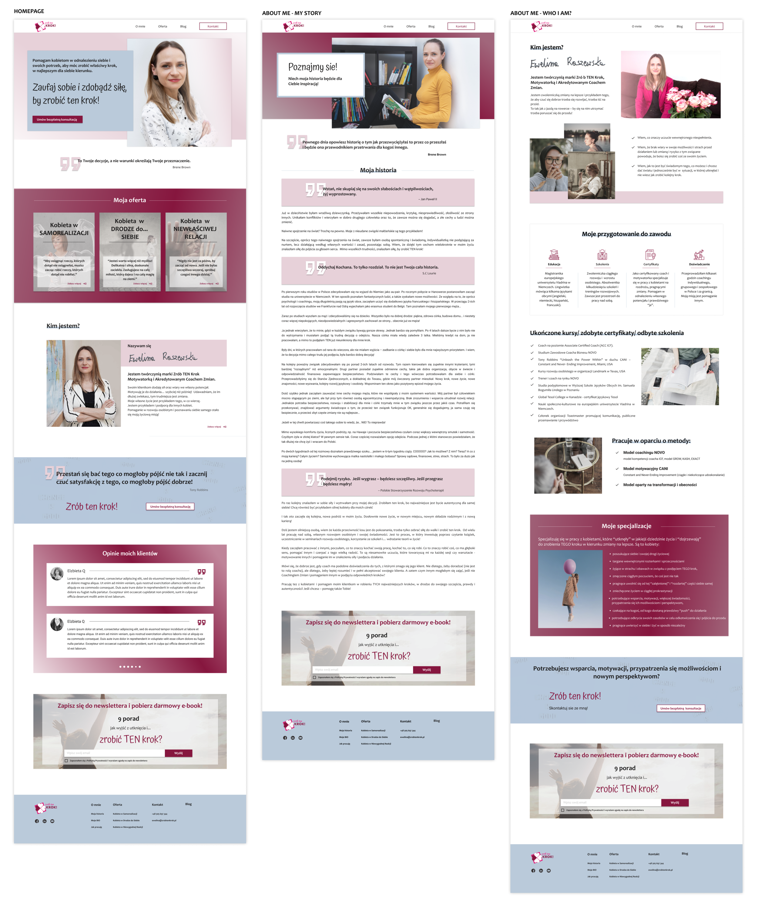 I moved on to determine the overall style and look for Zrob ten Krok! Combining notes from research, my customer expectations, and my own ideas of how I envisioned a women's coach, I decided to go for a brand feel that would encompass the words: professional, understanding, acceptance, strength & potential, and motivation. I chose a color palette that was centered around dark pink (my client's favorite color) and blue.