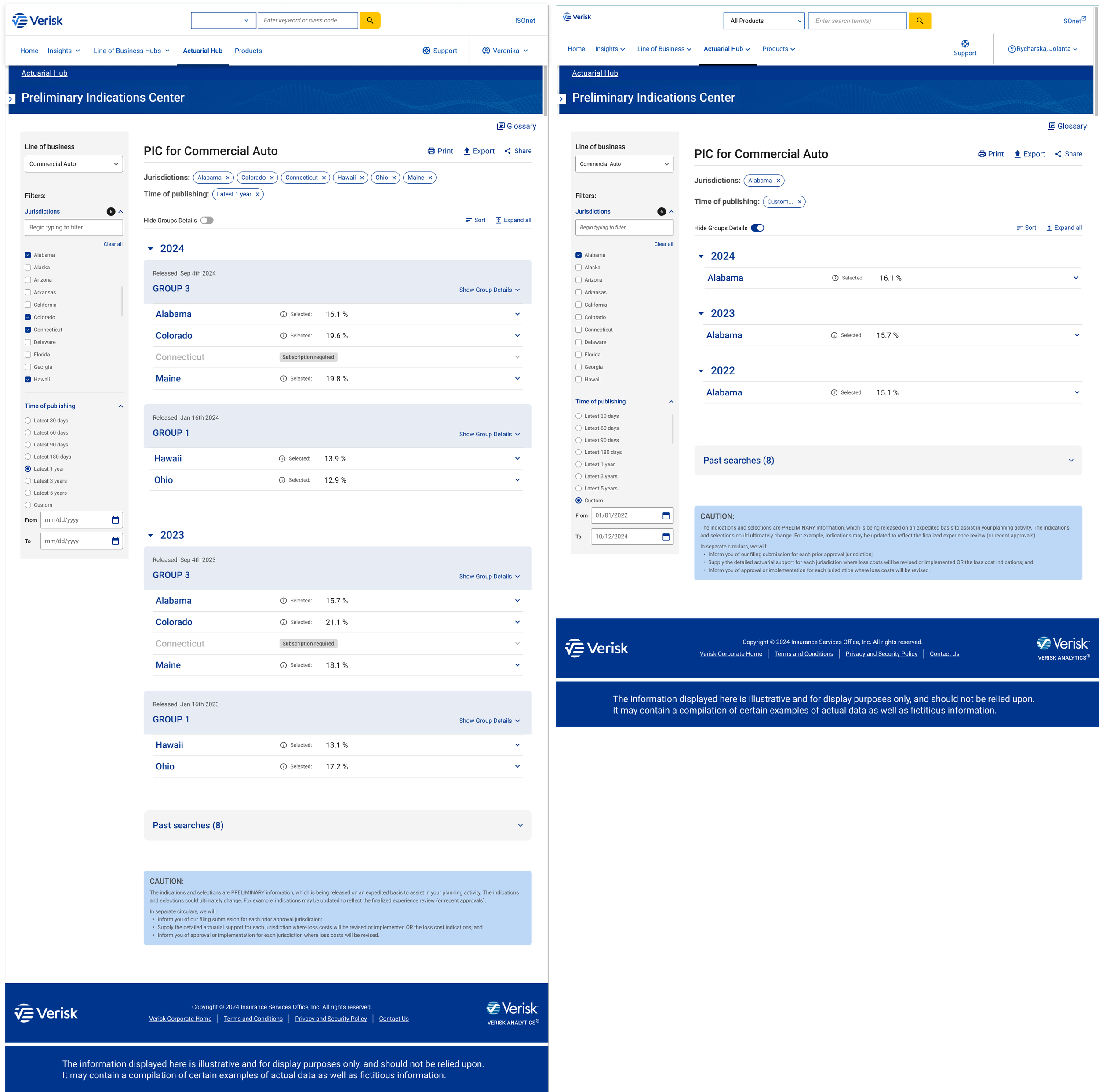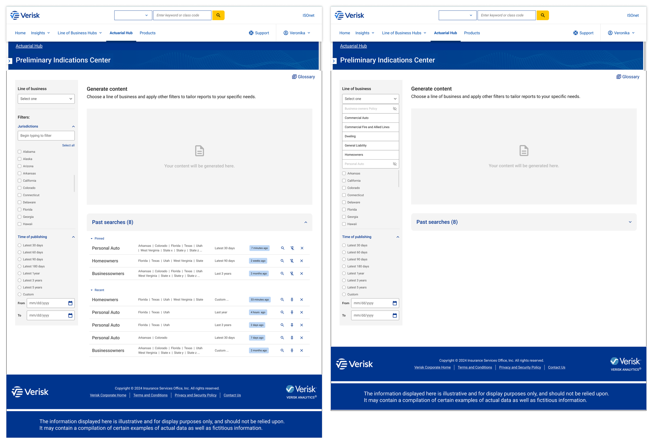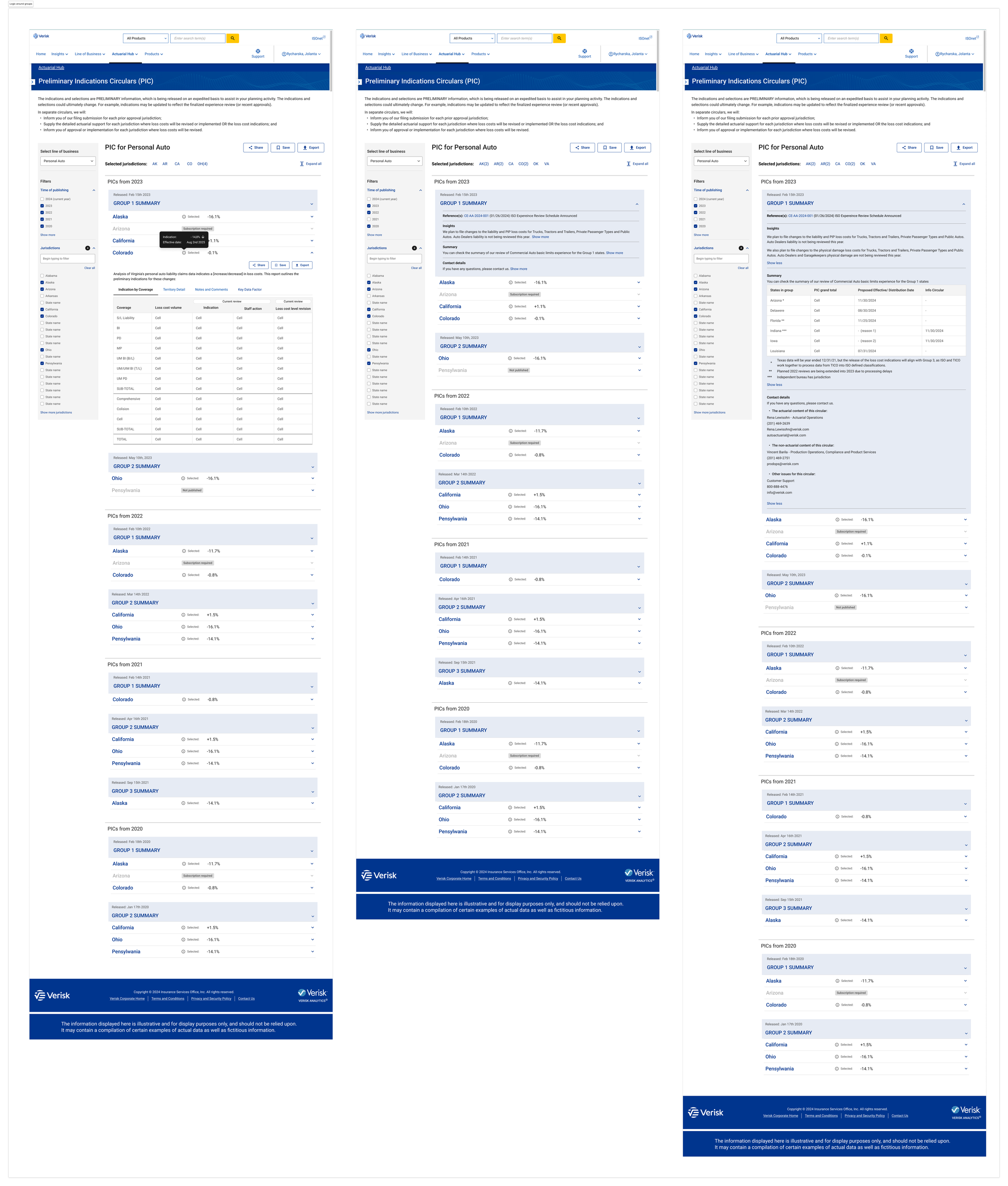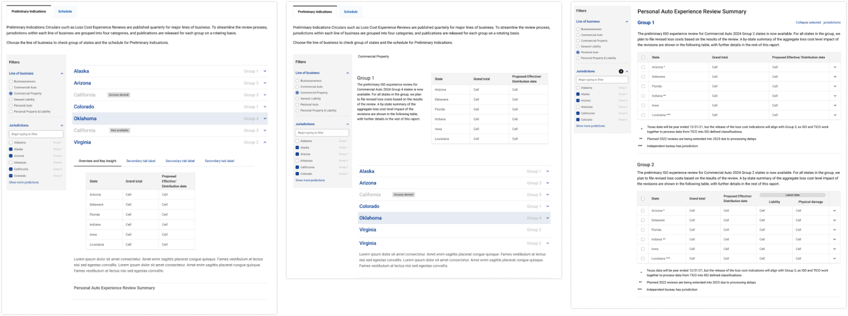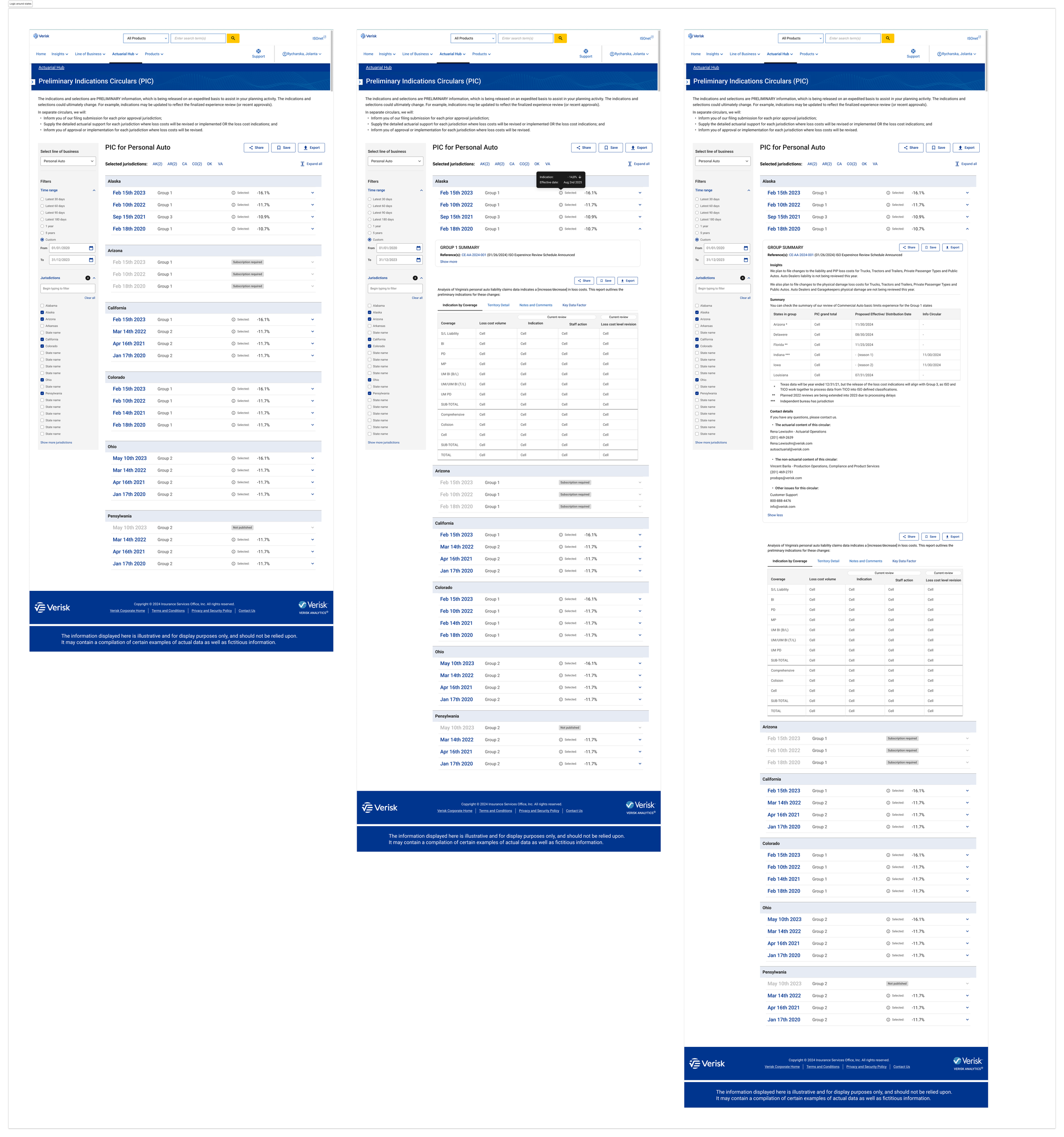 Project goal: The purpose of this project was to create a digital tool where Verisk users (actuaries and underwriters) could access and get on demand / filtrate/ export/download data from Preliminary Indications reports. New Prelimanry Indicattion Center should attract more clients and increase company revenue.