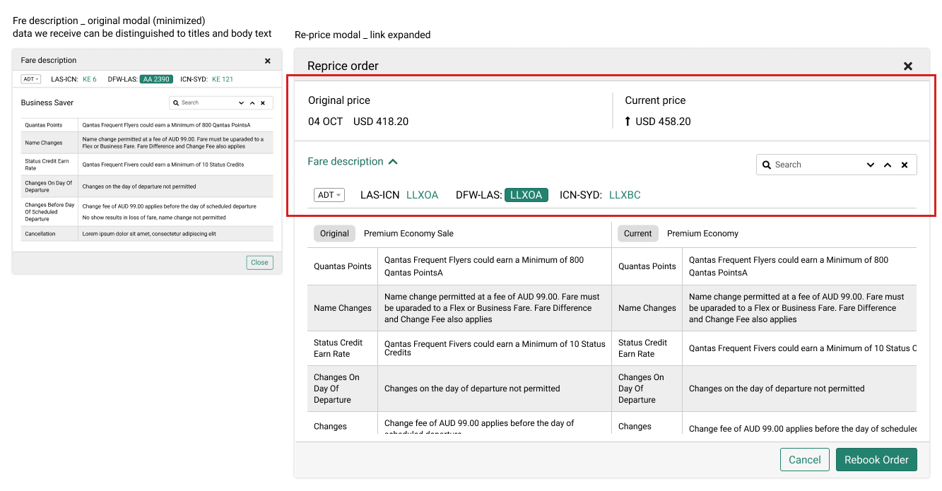 Some elements, such as the flight segments navigation bar and search component, will be common to both the original and current prices. Therefore, my idea was to have the same top section, with fare attribute details in two columns beneath.
