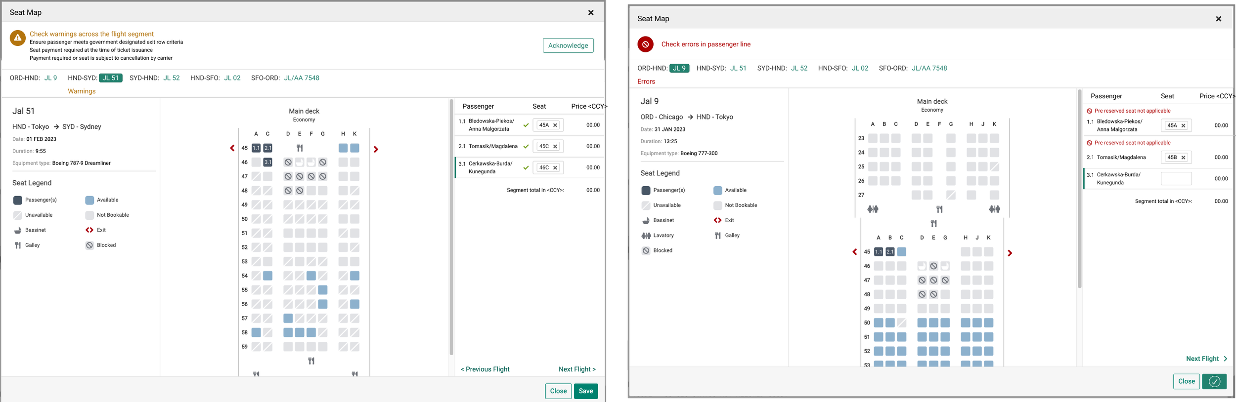 The interaction design I have created allows users to check the booking status of a particular flight segment at any time. The system will always display the status after the last changes have been saved. Additionally, clicking on the global Save button saves the changes in all other (currently inactive) segments. Error and warning messages will not disappear when they are saved.